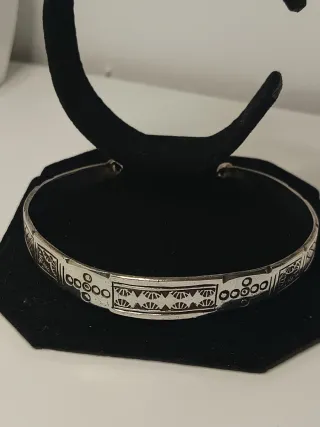Pulsera oval de plata de ley 925 con un diseño grabado. - Material: Plata de ley 925. - Modelo media caña oval semi rigida. -Grabada por toda la pulsera -Medida interior 60×50 mm. -Medida ancho 8 mm -Se entrega con caja. -Nueva, sin usar.