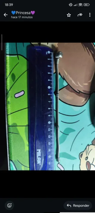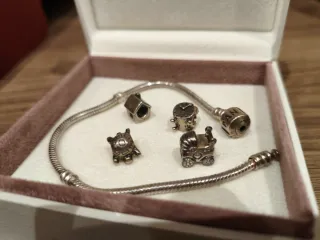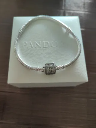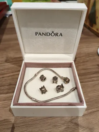 Conjunto Pandora. Original sin embalaje -Pulsera(medidas en la imagen ) -Cadena de seguridad - 2 charms ( paleta y 18) - Anillo ( talla 10) * La pulsera y todo el conjunto presentan signos de uso , no arañazos profundos , pero si leves y no falta ninguna piedra a ninguno de los productos y hay capturas de precio original en tienda . * El precio es por conjunto (negociable) y si se quiere algo especifico tambien se puede negociar *Si necesitan mas fotos por favor escriban sin compromiso :) *** SOLO RECOGIDA EN MANO ***