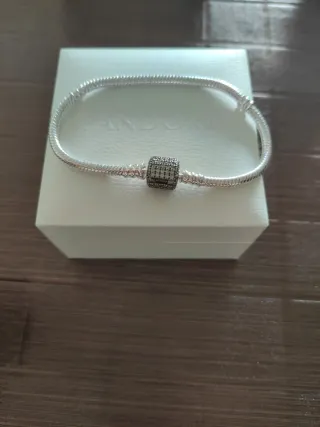 Elegante pulsera de la marca Pandora, con un diseño de cadena de serpiente y un charm central adornado con pequeñas piedras brillantes. - Diseño de cadena de serpiente. - Charm central con incrustaciones. - Cierre seguro.17cm