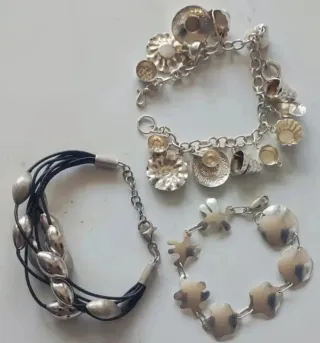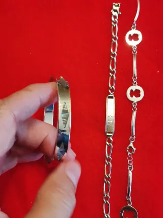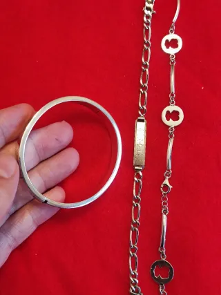 Conjunto de tres pulseras de plata, cada una con su contraste.las vendo juntas o por separado,la esclava se puede regrabar su nombre,una de ellas está a reparar,a buen precio, acepto ofertas razonables - Diseño elegante y atemporal. - Material: Plata. - vendo juntas o por separado