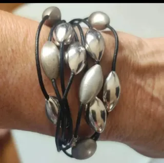 Pulsera Vintage con eslabones circulares hecha a mano en plata de ley con 16 colgantes tematica de cocina Mide 18 cm 50 euros Pulsera plata de ley con eslabones tipo chapa con varias formas 18 euros Pulsera cuero y bolas tipo lagrima en mate y brillo Son 7 vueltas y 11 bolitas 30 euros