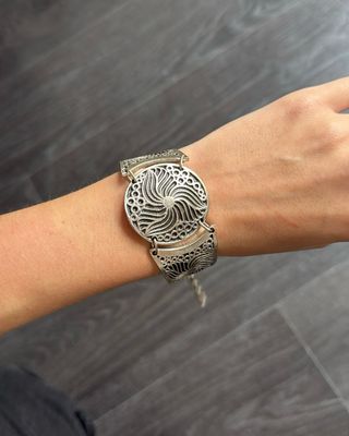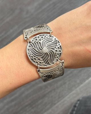 Elegante pulsera con un diseño intrincado y detalles tribales. - Acabado metálico. - Diseño circular central. - Piezas laterales con motivos grabados.
