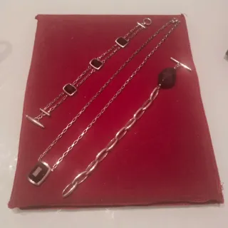 Lote de 2 pulseras con detalles en negro y acabado plateado. Y un collar todo acero y piedra negra - Pulsera doble con gemas cuadradas. - Pulsera con gema facetada. - Collar con gema rectangular.