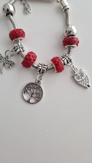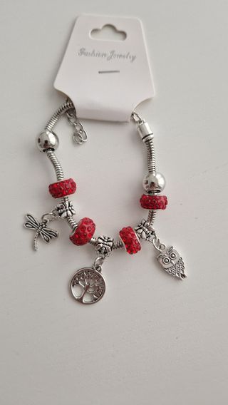 pulsera de cuentas en color plateado con 4 cuentas en rojo. De ella cuelgan 3 símbolos de la suerte, el buho, el arbol de la vida y la libélula. Sin estrenar, ideal para regalo. hago envíos!