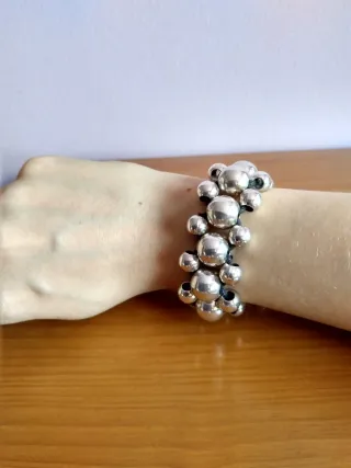 Elegante pulsera elaborada en Plata de Ley. Bolas de 1,5 cm. diámetro. - 9 bolas montadas más una suelta. Med: 19 cm + 2 cm de la bola suelta. Peso: 44 gr . - Diseño con esferas. - Cierre de seguridad. Vintage Con estuche artesanal para regalo