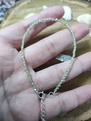 Pulsera en plata de ley y olivino facetado en bola de 3mm combinado con piezas de plata. El olivino o peridoto, es valorado por sus propiedades de protección contra la negatividad, limpieza energética, y para atraer la abundancia, la felicidad y la buena suerte -Largo 16 cm + 3cm de cadena alargadera