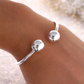 Elegante pulsera abierta con un diseño moderno. - Acabado brillante. - Dos esferas decorativas en los extremos.