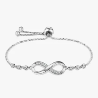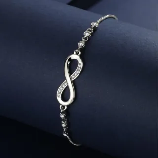 Elegante pulsera con diseño de infinito y circonitas. Perfecta para un regalo especial. - Fabricada en Plata de Ley 925. - Adornada con circonitas brillantes. - Cadena ajustable con cierre de bola. Con caja de regalo 🎁