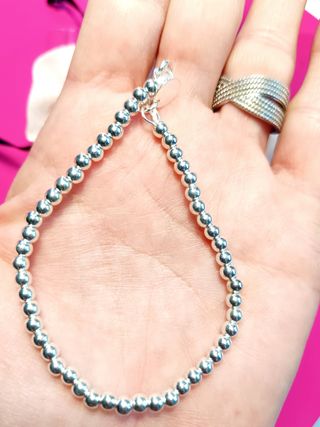 34 bolas de plata para hacer pulsera de 17 cm. Cada bolita mide 0,5 cm. El agujero tiene un ancho de 0,2 cm.
