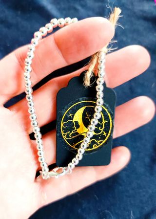 Piel, bolas plateadas y perlas de rio. Hecha por mi. Medida 17 cms