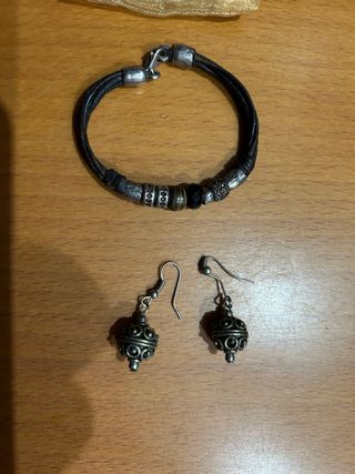-Conjunto de plata : •pendientes colgantes con gancho y con una bola con dibujos geométricos. •pulsera con piedras y adornos en plata y tiras de cuero. Con cierre. •bolsa de tela dorada para guardar. -NUEVO.