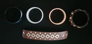 Conjunto de nueve pulseras y un anillo. - Pulsera de cuero marrón con adornos metálicos. - Pulsera de resina con diseño marmoleado. - Pulsera rígida blanca. - Pulsera rígida en tono melocotón. - Pulsera rígida con estampado animal print. - Pulsera de eslabones con perlas y cuentas plateadas. - Pulsera de eslabones cuadrados con detalles en tonos tierra. - Pulsera de perlas blancas y cuentas grises. - Pulsera de cordón negro con cuentas y una piedra turquesa. - Anillo con circonitas.