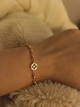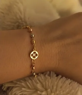 Elegante pulsera con baño de oro de 14 quilates y detalles en plata. Su diseño combina esferas de diferentes metales y un charm central. - Baño de oro 14k. - Charm central con diseño de trébol y circonita. - Combinación de esferas doradas y plateadas.