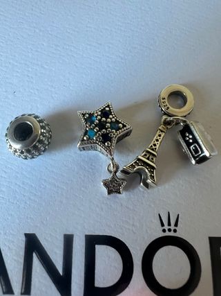 Conjunto de cuatro charms para pulsera. - Charm con forma de estrella y circonitas. - Charm con forma de Torre Eiffel. - Charm con forma de cámara de fotos. - Charm esférico con circonitas.