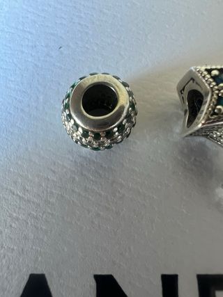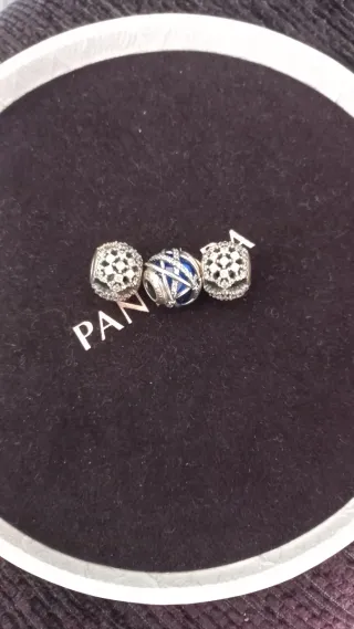 Conjunto de tres charms para pulsera Pandora. - Dos charms con diseño de filigrana y circonitas. - Un charm central con detalles en azul y circonitas.
