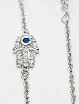 Preciosa pulsera de plata con dije de mano de hamsa y un brillante ojo turco azul. Es una pieza delicada y elegante. -Modelo clasico -Ideal para un regalo -Nuevo a estrenar -Con alargador +5cm -largo de pulsera 17cm -La mano mide 12mm alto y 7mm ancho -Dije de mano de Fátima con circonitas. -Ojo turco azul brillante.