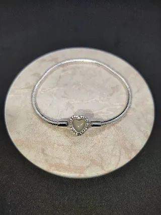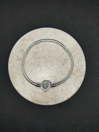 Elegante pulsera base para charms con cierre en forma de corazón. El corazón está adornado con pequeñas circonitas brillantes que le dan un toque de luz. - Diseño de corazón. - Acabado plata s925. - Compatible para charms Pandora y similares. - Brillo en oscuridad