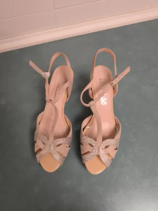 Elegantes sandalias de tacón en tono nude, perfectas para complementar tu atuendo. - Diseño con tiras cruzadas en la parte delantera. - Acabado en ante y detalles plateados. - Cierre con pulsera al tobillo. - Tacón fino y cómodo. Dos usos,ahora ya no uso tacón.