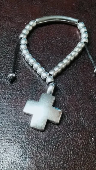 Pulsera con un diseño moderno y un colgante de cruz. - Cuentas plateadas. - Colgante en forma de cruz. - Cierre ajustable con cordón negro.