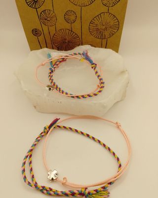 Conjunto de dos juegos de pulseras con diseño de cruz. Perfectas para ti y tu mejor amiga. - Cuentan con un detalle de cruz, de latón plateado, sobre un cordón ultrafino de algodón encerado de color salmón. Mide 1 mm grosor y es ajustable. - Elaboradas con hilos trenzados en varios colores, turquesa, fucsia, amarillo y rosa. - Cierre ajustable. Embalaje y etiquetado adecuado para regalo, nuevas. Producto realizado artesanalmente. Envío con GLS y Correos. Inpost/Mondial Relay envío los viernes.