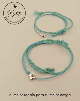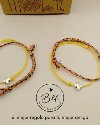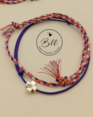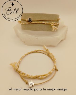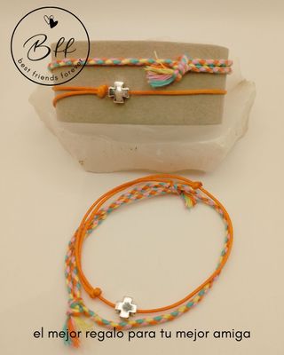 Conjunto de dos pulseras con diseño BFF y detalle de cruz. - Pulseras trenzadas con hilos de colores. - Cuentan con un charm de cruz plateado, sobre cordón de algodón encerado ultrafino. - Cierre ajustable. - Incluye dos juegos. Embalaje y etiquetado adecuado para regalo, nuevas. Producto realizado artesanalmente. Envío con GLS y Correos. Inpost/Mondial Relay envío los viernes.