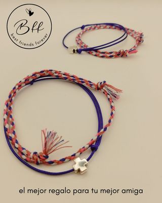 Conjunto de dos pulseras con diseño de cruz y detalle BFF best friends forever. - Cuerda trenzada en tonos azul, rosa y blanco. Algodón. - Cuerda con charm en forma de cruz plateada, de 8x8 mm. Cor ́don de 1 mm de grosor. - Cierre ajustable. - Incluye dos juegos. Embalaje y etiquetado adecuado para regalo, nuevas. Producto realizado artesanalmente. Envío con GLS y Correos. Inpost/Mondial Relay envío los viernes.