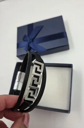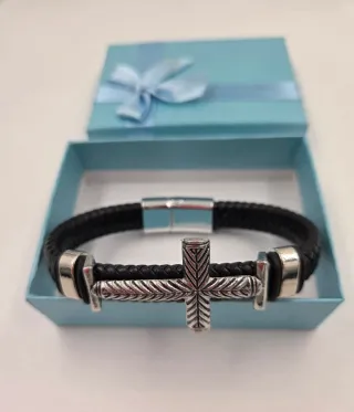 Pulsera de polipiel negro con detalle en acero en 2 modelos distintos a elegir. 1 es con una cruz plateada y el otro diseño plateado. En su cajita para regalo. Se hacen envios. Se entrega en yuncos. Mira mi perfil más modelos y cositas. 682626910