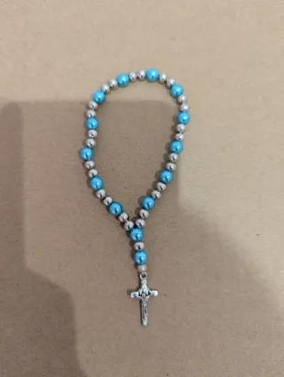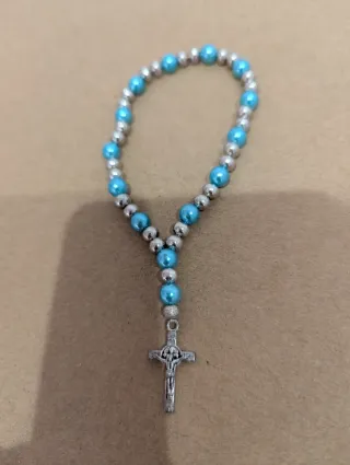 Pulsera elástica con cuentas azules y plateadas, adornada con una cruz. - Diseño con cuentas alternas. - Detalle de cruz.