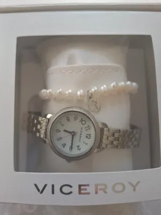 Conjunto de reloj Viceroy para niña y pulsera de perlas. En su caja ,nunca se uso ,fue un regalo de Comunión. - Esfera blanca con números. - Pulsera de eslabones plateados. - Pulsera adicional de perlas blancas con charm de cruz.