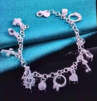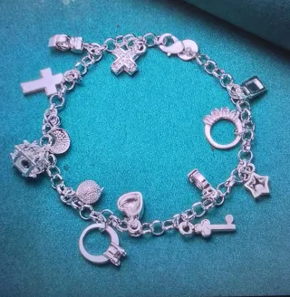 Pulsera de plata ley 925 con varios dijes. - Dijes variados: cruz, corona, corazón, estrella, llave, anillo, etc. - Cierre de mosquetón.