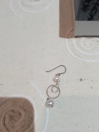 Detalles de las piezas: Pulsera de perlas y piedra verde: Se trata de una pulsera elástica compuesta por perlas blancas redondas ( cultivadas de agua dulce) con una cuenta central de piedra verde, identificada como jade o ágata verde. Pendientes de aros entrelazados: Son pendientes colgantes de plata con un diseño de múltiples círculos o aros interconectados. Set de perlas en caja: La caja inferior contiene varias perlas blancas individuales, que son perlas para la creación de collares o parte de un conjunto de pendientes de botón de varios tamaños.