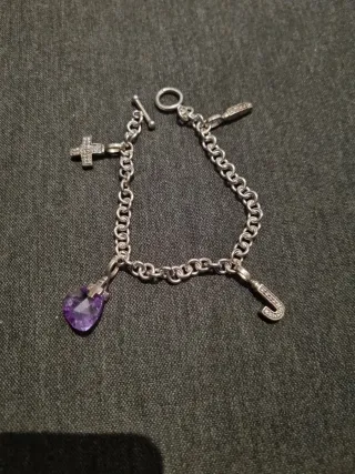 Elegante pulsera de la marca Joop, elaborada en plata y con varios colgantes. - Colgante de cruz con pequeñas incrustaciones. - Colgante de letra J con pequeñas incrustaciones. - Colgante de piedra morada en forma de triangulo. - Colgante alargado con incrustaciones. - Cierre de tipo T-bar. - Preciosa pulsera en plata 925, usada pero esta como nueva.
