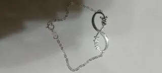 Elegante pulsera con diseño de infinito, personalizable con nombres. - Acabado en plata. - Diseño de infinito con nombres grabados. - Cierre ajustable.