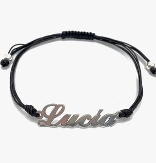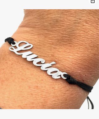Elegante pulsera con nombre personalizado en plata, montada sobre hilo negro. - Nombre en plata. - Hilo ajustable para mayor comodidad. - Diseño moderno y versátil. PÍDEME EL NOMBRE QUE QUIERAS