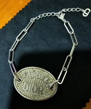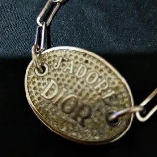 Elegante pulsera con el nombre de la marca. - Diseño ovalado con J'adore Dior grabado. - Cadena de eslabones plateada. - Cierre de mosquetón.