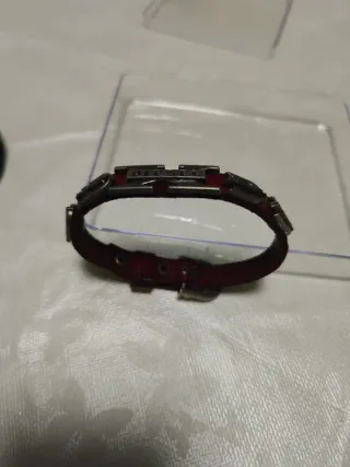 2 Pulsera de la marca Diesel con un diseño llamativo.y una de la marca uno de 50. - Correa de cuero en color rojo. - Detalle central metálico con el nombre de la marca. - Elementos decorativos plateados a los lados.