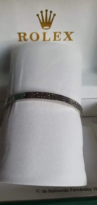 Elegante pulsera de la prestigiosa marca Rolex, con un diseño grabado. - Diseño grabado con el nombre de la marca y año. - Acabado plateado.