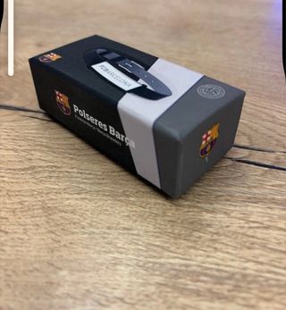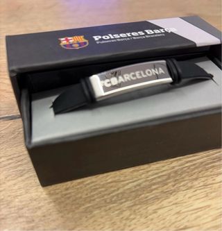 Pulsera con el escudo y nombre del FC Barcelona. - Diseño elegante en color negro y plateado. - Presentada en su caja original.