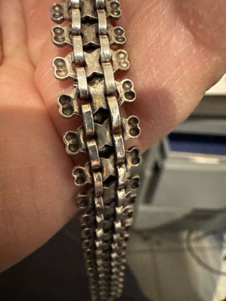 Pulsera de plata de ley con un diseño étnico y un toque vintage. Su estilo la hace una pieza única. - Diseño con motivos inspirados en la cultura étnica. - Acabado envejecido que realza su carácter vintage. - Cierre seguro y práctico. Pulsera de plata de ley (punzón visible en el cierre), con trabajo artesanal y pátina natural. Diseño con relieve y buena articulación. Pieza con carácter, no industrial ni bisutería. Medida: talla media, 17 cm de enganche a enganche (ideal para muñeca fina o media).