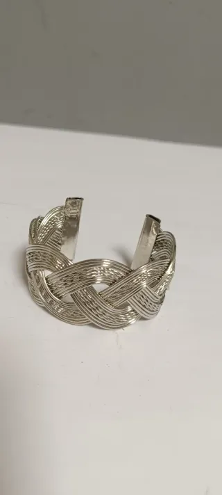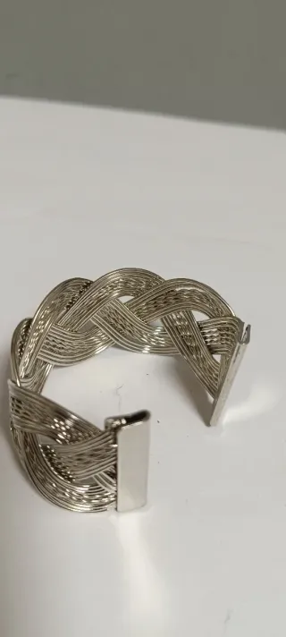 Elegante pulsera con un diseño tejido intrincado. - Fabricada con alambre fino. - Cierre de lengüeta seguro.
