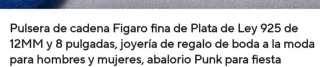 Pulsera de cadena Figaro fina de Plata de Ley 925. - Medida: 12MM de ancho y 8 pulgadas de largo. - Diseño a la moda, ideal como regalo. - Estilo Punk, apta para fiestas.
