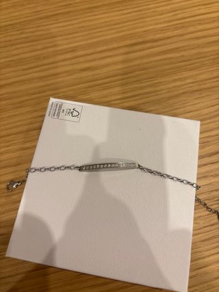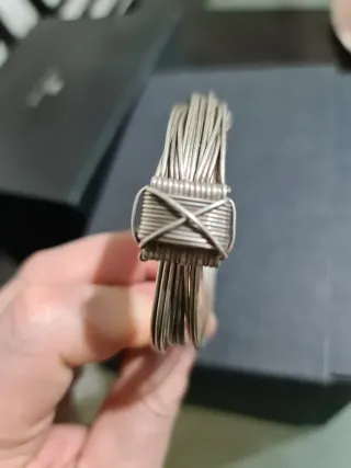 Pulsera de acero inoxidable con acabado plateado brillante. Diseño moderno y fino, formada por doble banda rígida con detalle central decorativo, que le da un toque elegante y sofisticado. 🔹 Material: acero inoxidable 🔹 Tipo: pulsera rígida / brazalete 🔹 Color: plateado 🔹 Estado: muy buen estado, poco uso 🔹 Incluye caja (como se muestra en las fotos) Ideal para llevar sola o combinada con otras pulseras. Un complemento atemporal que encaja tanto en looks diarios como más formales. 📦 Envío rápido y bien protegido.