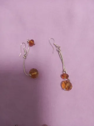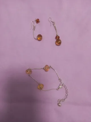 Elegante conjunto de joyería compuesto por pendientes y pulsera. - Pendientes colgantes con cuentas de ámbar. - Pulsera fina con cuentas de ámbar. - Cierre de mosquetón con cadena de ajuste.