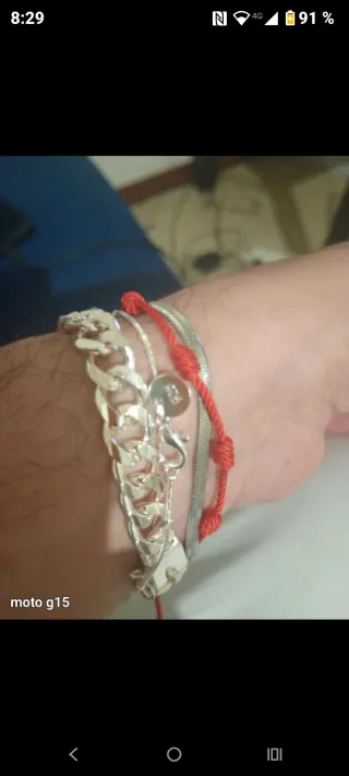 Conjunto de pulseras de plata para hombre y mujer. - Pulsera de eslabones anchos de plata. - Pulsera fina de plata. - Pulsera de hilo rojo con nudos.