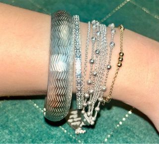 Una de las pulseras algo torcida. Muy finas, 7 CMS de diámetro, tal como se ven en las fotos