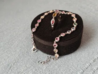 Conjunto de pulsera y anillo con piedras de colores. Conjunto de plata y cristales de colores - Diseño delicado, fino y elegante. - Piedras engarzadas en plata Pulsera finita‼️largo 15 máximo 17cm Se agranda con cadena de 15 cm a 17 MIRAR LAS FOTOS Anillo plata 980, plata de alta calidad con 4 cristales de colores Talla 12 diámetro 16-17mm Foto 9