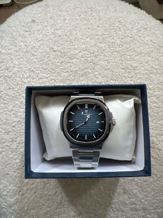 Elegante reloj de pulsera con esfera azul y detalles plateados. - Diseño moderno y versátil. - Correa de acero inoxidable. - Indicador de día de la semana.