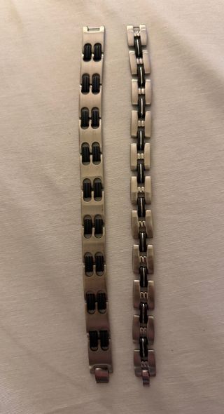 Dos pulseras de estilo moderno, combinando plata y detalles en negro. - Diseño robusto y elegante. - Cierre seguro y cómodo. - Materiales de calidad. Se venden por separado, 45€/unidad