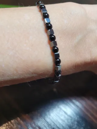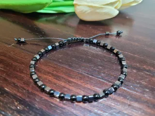 Elegante pulsera con cuentas de piedra natural. - Diseño con cuentas redondas negras de ónix - Cubos de hematita de 3mm intercalados Elaborada de forma srtesanal con buenos materiales. Para muñeca de 17-18 cms. Unisex, perfecta para hombre si quieres un detalle bonito 🎁. Propiedades del ónix: Amuleto de protección, se cree que ayuda a alejar las energías negativas y promueve la seguridad, armonía y estabilidad. Fomenta la sinceridad y la transparencia. Propiedades de la hematita: Es una piedra de conexión con un fuerte potencial energético y de anclaje. Protege y equilibra el cuerpo y la mente. Se dice que aumenta la confianza