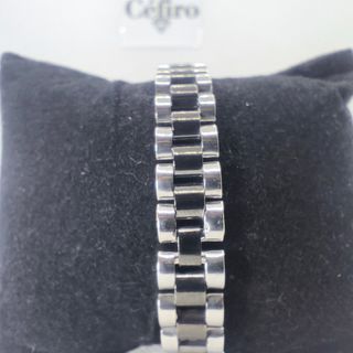 Pulsera de diseño icónico con detalles en plata y negro. - Pieza de joyería elegante. - Acabado metálico pulido. - Inserciones en material oscuro.